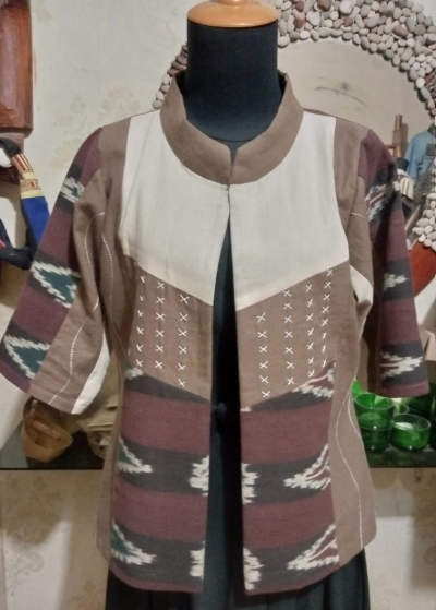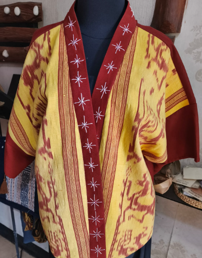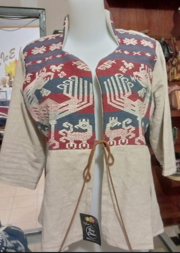Outer Perempuan, khas Sumba, motif ayam jago, bahan Natur Linen, pewarna alam ukuran L